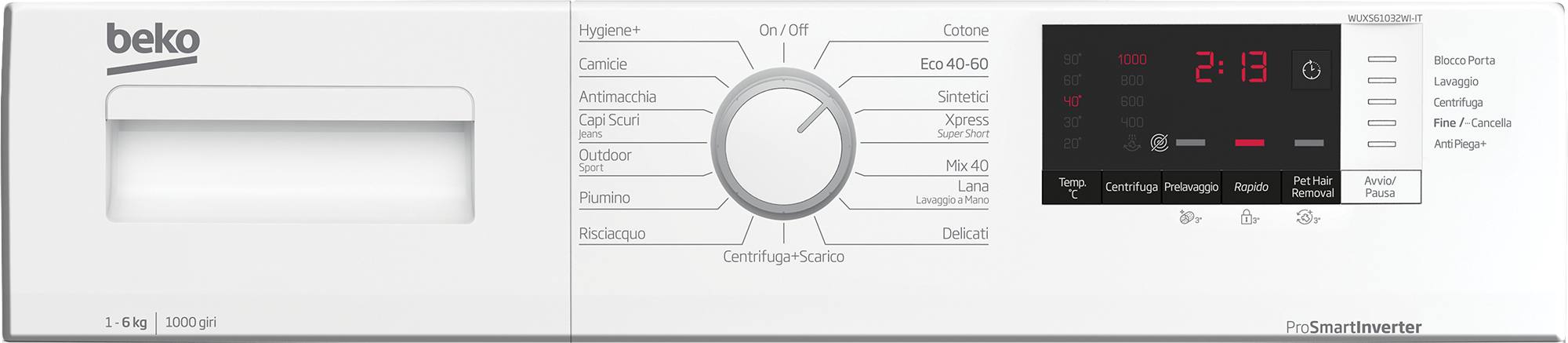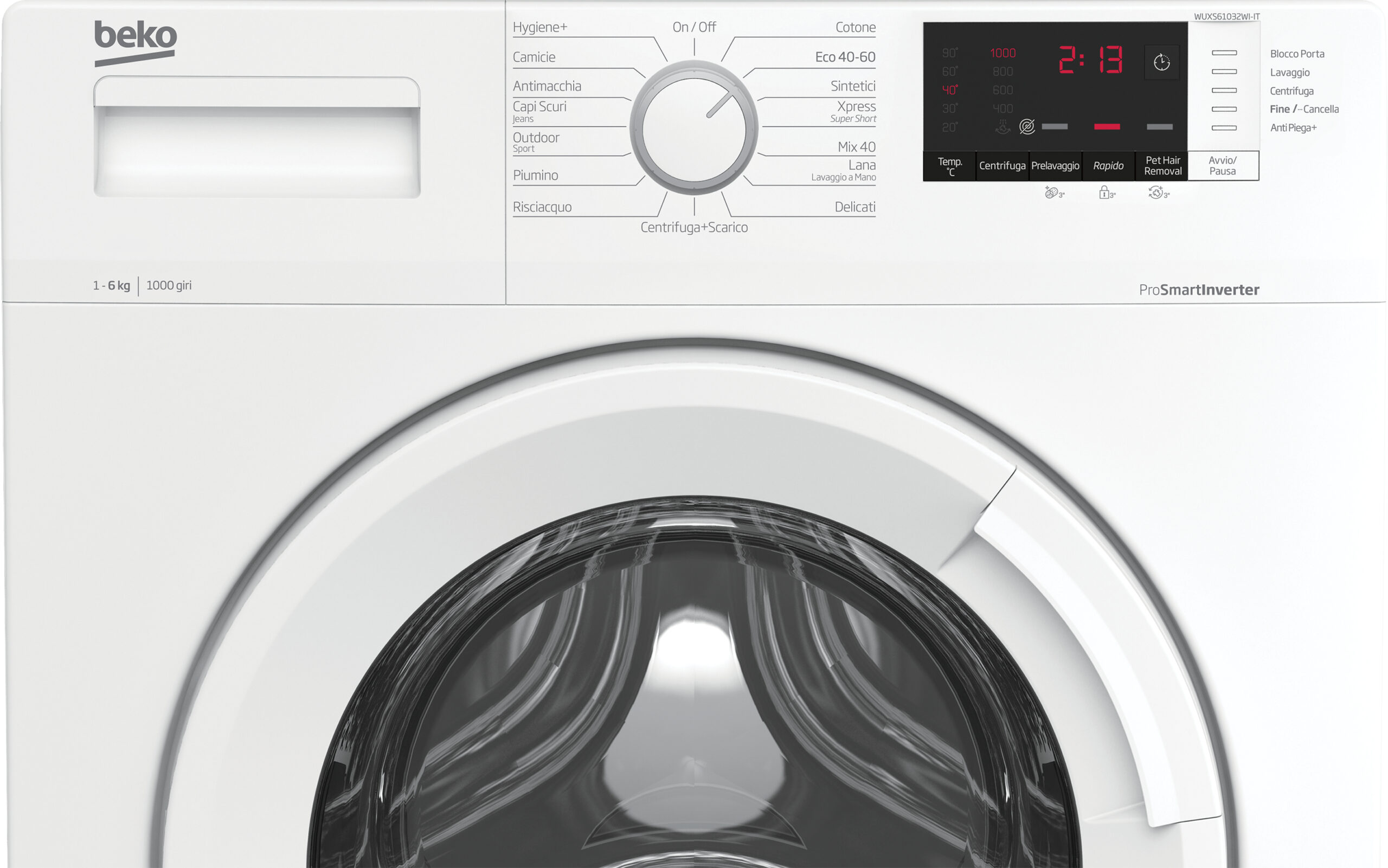 Beko WUXS61032WI-IT: Lavatrice 6 kg Slim, Classe D, 1200giri. Tipo di carica: Caricamento frontale. Capacità cestello: 6 kg, Classe di efficienza della centrifuga: C, Silenziosità (centrifuga): 74 dB, Velocità di centrifuga massima: 1000 Giri/min. Colore del prodotto: Bianco. Larghezza: 60 mm, Profondità: 440 mm, Altezza: 845 mm. Classe efficienza energetica: D