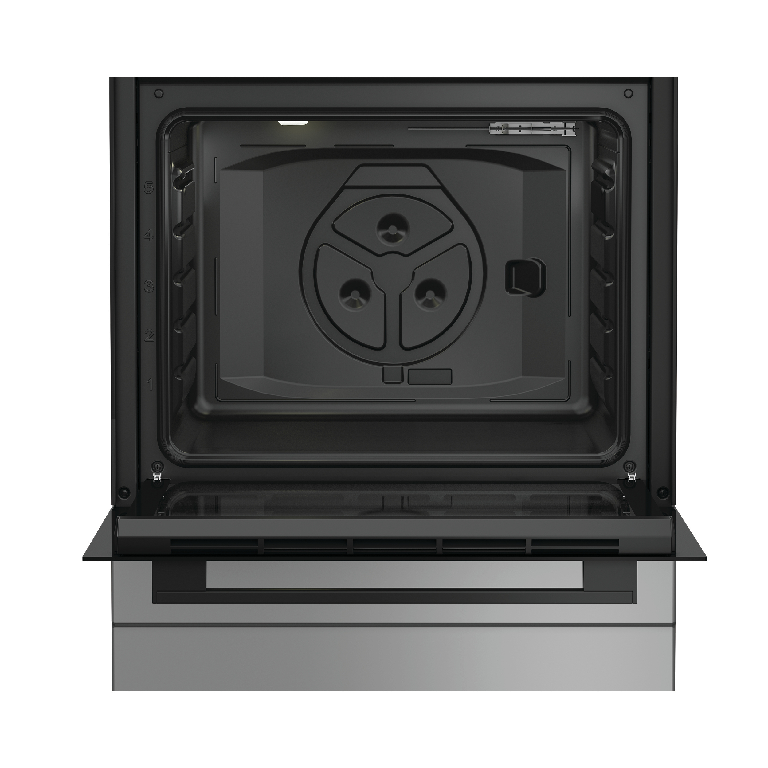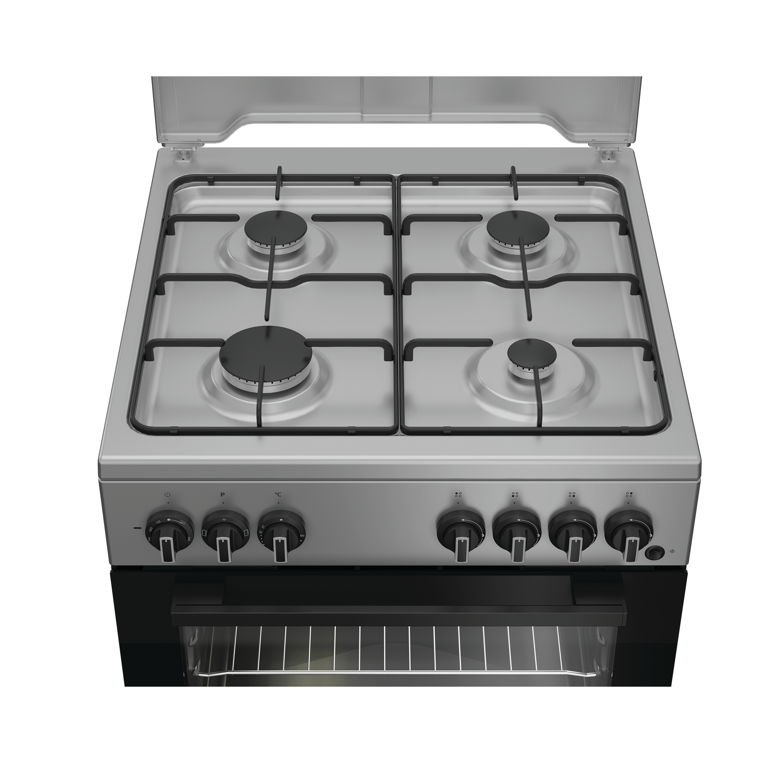 Indesit I6G3PMS. Tipo di prodotto: Cucina, Colore del prodotto: Acciaio inox, Tipo di controllo: Manopola. Tipo di piano cottura: Gas, Numero totale di fuochi: 4 Fornello(i), Tipo di superficie superiore: Acciaio inox. Dimensione del forno: Media, Sorgente di alimentazione del forno: Elettrico, Capacità netta del forno: 73 L. Tipo di timer del forno: Meccanico. Classe efficienza energetica: A, Consumo energetico (convenzionale): 0,82 kWh, Scala di efficienza energetica: Da A+++ a D