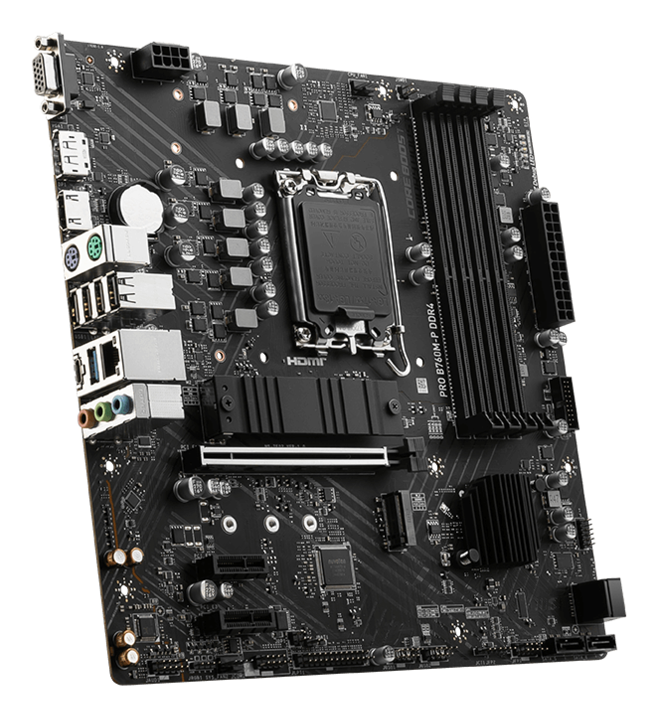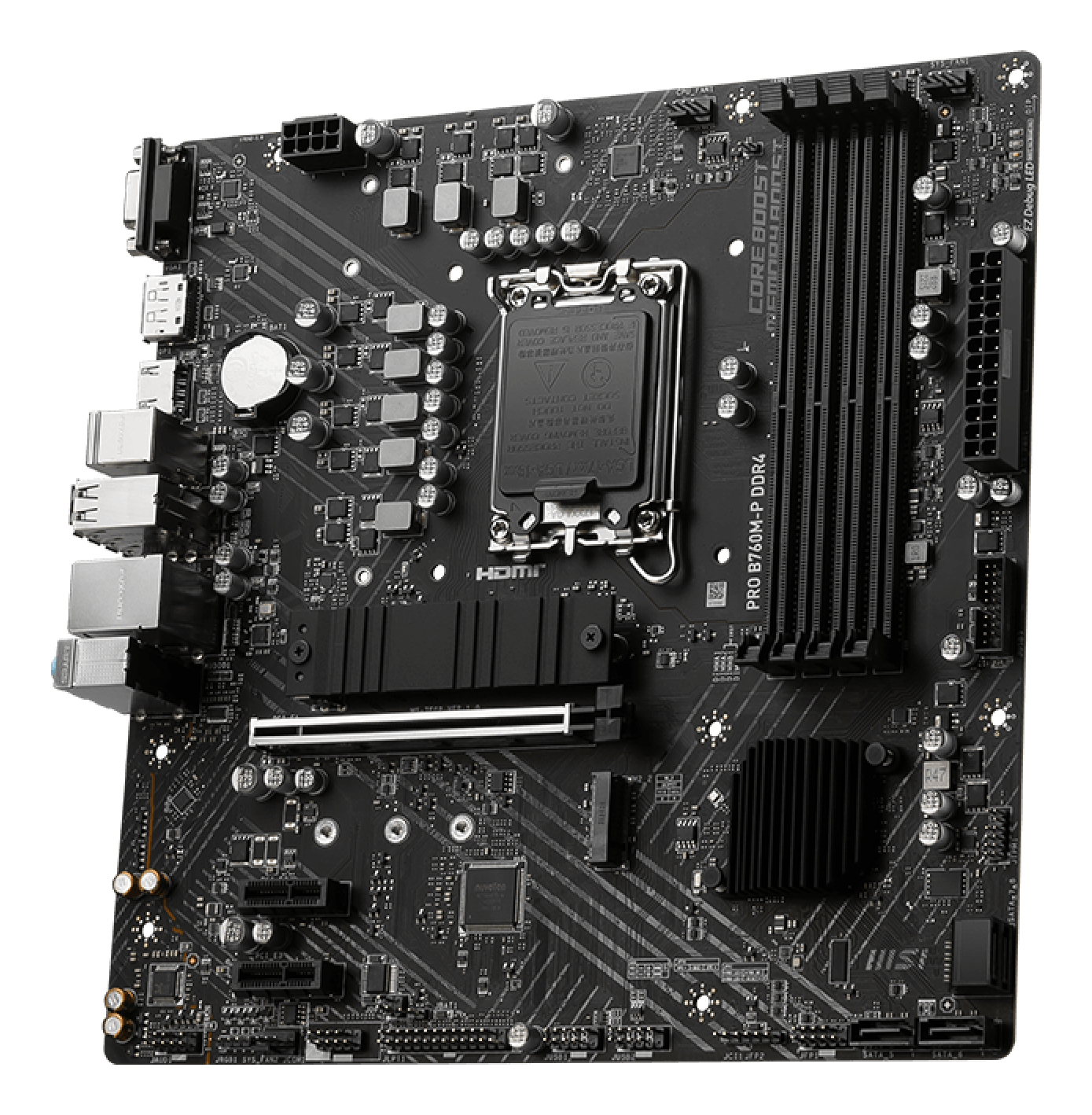 MSI PRO B760M-P DDR4. Produttore processore: Intel, Presa per processore: LGA 1700, Processori compatibili: Intel® Celeron®, Intel® Pentium® Gold. Tipi di memoria supportati: DDR4-SDRAM, RAM massima supportata: 128 GB, tipo di slot di memoria: DIMM. Interfacce dell’unità di archiviazione supportate: M.2, SATA III, Livelli RAID: 0, 1, 5, 10. Tipo di interfaccia Ethernet: 2.5 Gigabit Ethernet. Componente per: PC, Fattore di forma scheda madre: micro ATX, Famiglia di chipset per scheda madre: Intel