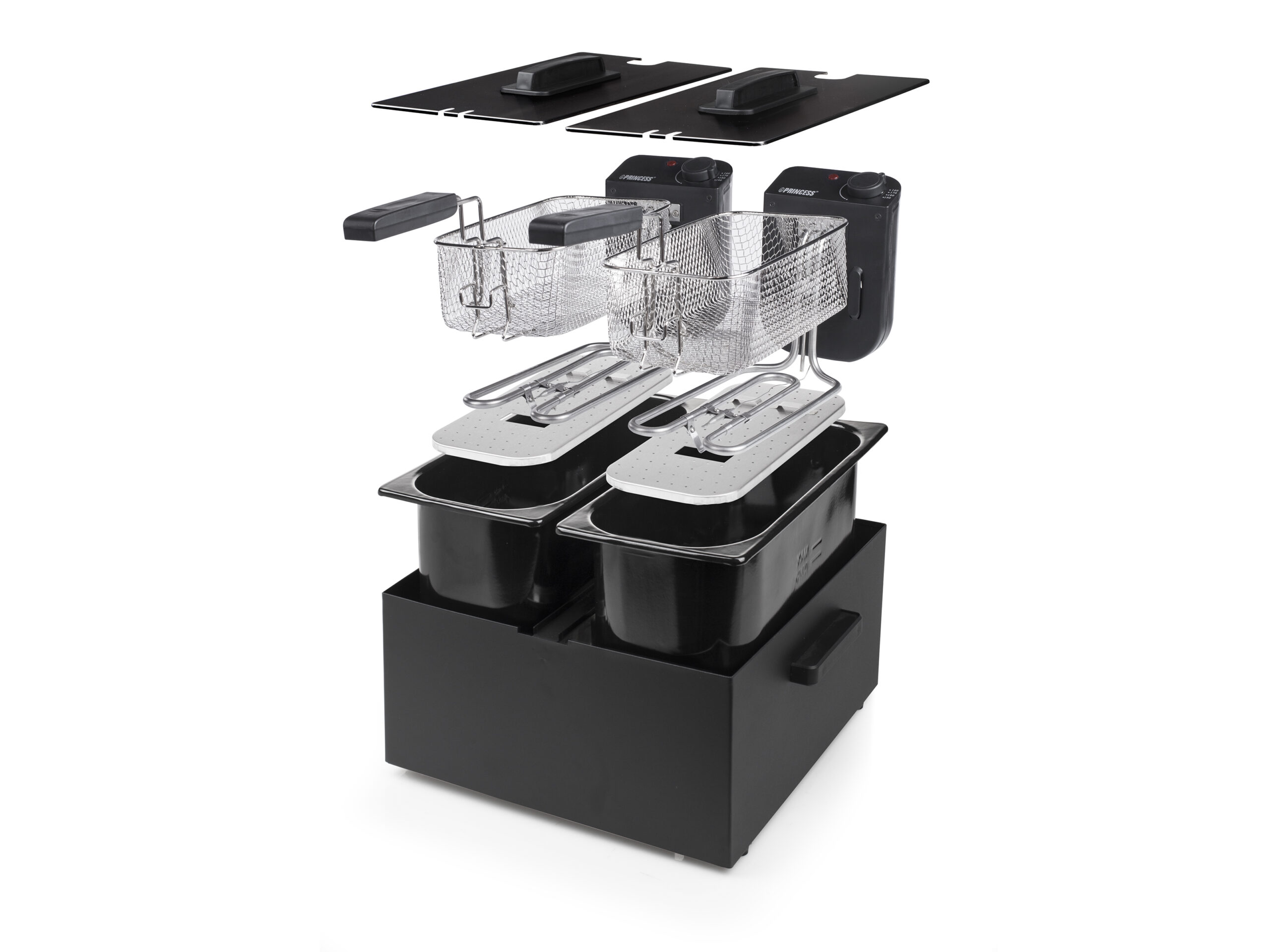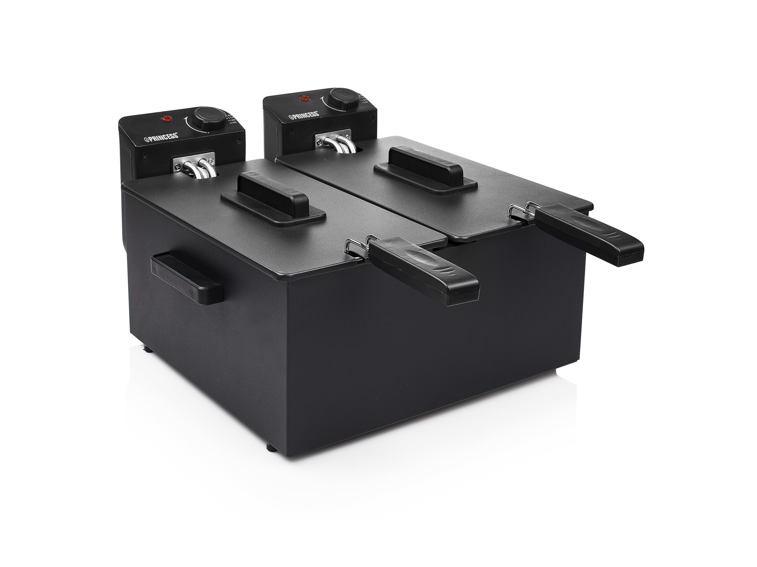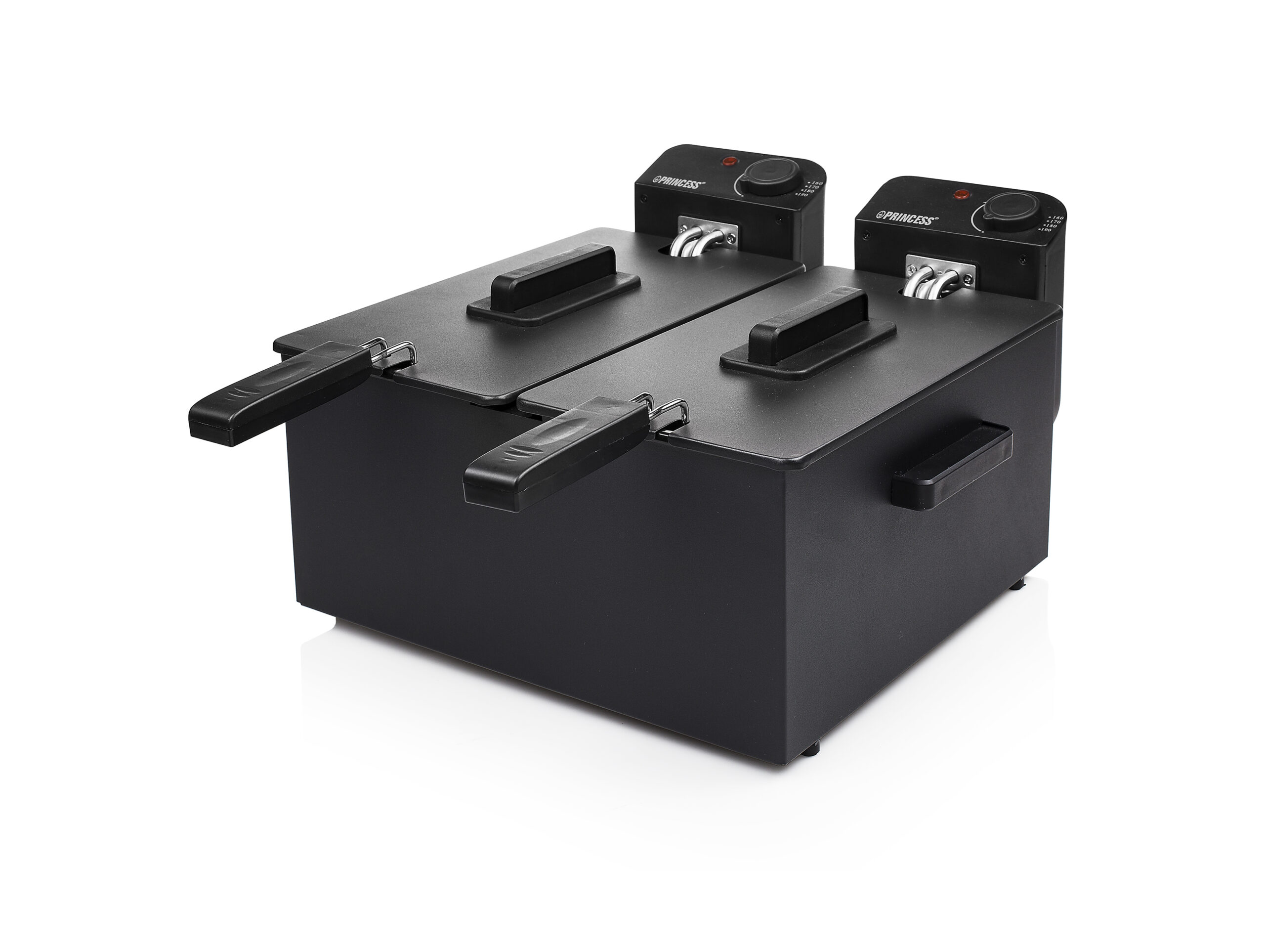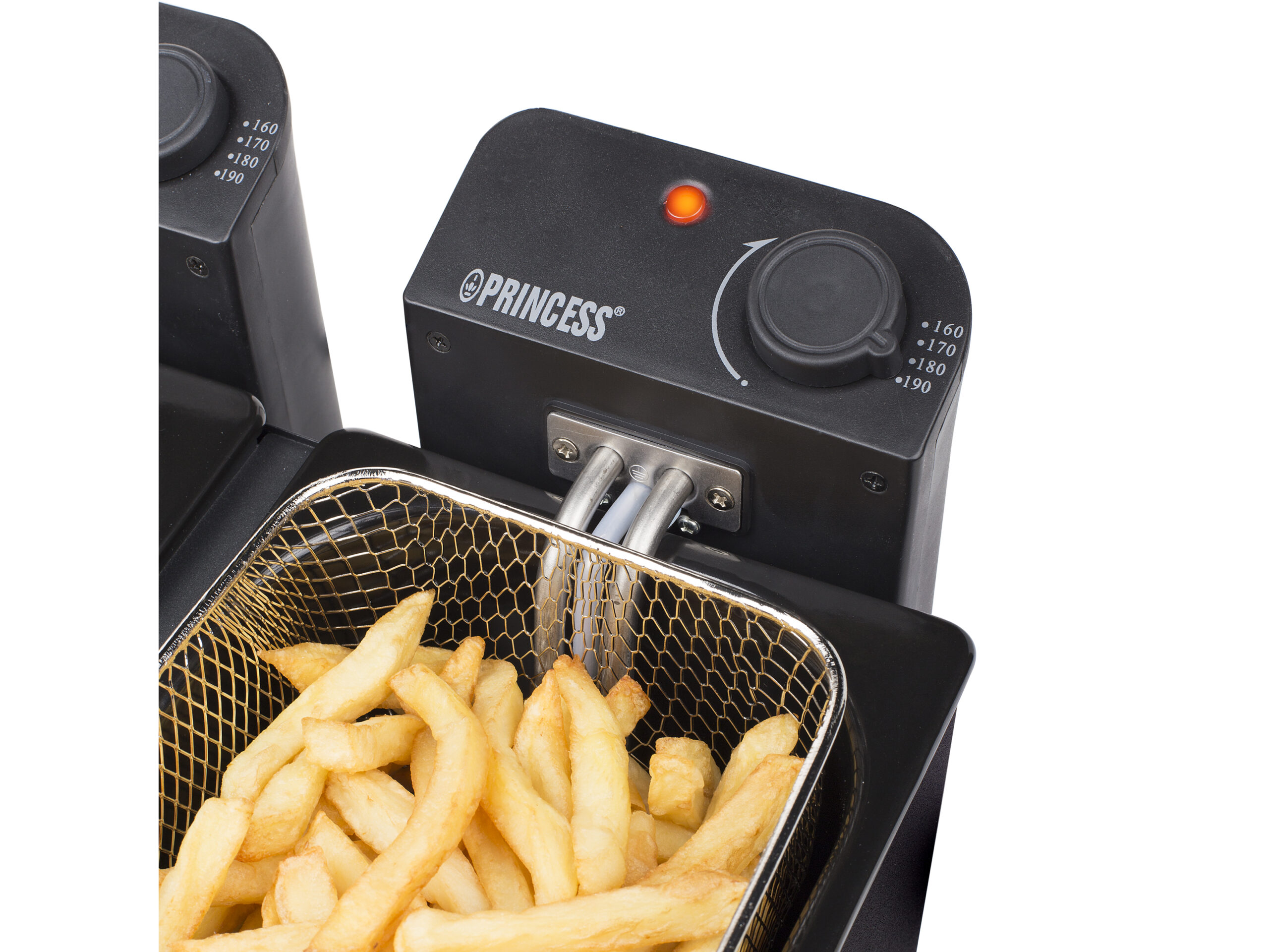 Doppia friggitrice Princess 183028 Black – Zona fredda – Capacità 2 X 3 litri Raddoppia la frittura e prepara pesce e patatine per tutta la famiglia in una volta sola, grazie a questa potente doppia friggitrice Princess 183028 Black. La friggitrice si riscalda molto rapidamente grazie all’elevata potenza di 2 x 1800 Watt. Entrambi i recipienti condividono la stessa spina, ma possono essere usati separatamente. Zona fredda per una frittura sana Un problema di molte friggitrici è quello di bruciare le briciole che cadono attraverso il cestello quando usi l’olio più di una volta. La doppia friggitrice Princess ha una speciale zona fredda che evita che questo accada. Tutte le piccole particelle finiscono nella zona fredda sotto l’elemento riscaldante e non bruciano. In questo modo, l’olio resta pulito molto più a lungo e non troverai resti neri nelle patatine. Sistema a spina singola per una maggiore sicurezza La doppia friggitrice Princess ha una sola spina di corrente e richiede una sola presa a parete per funzionare. I due elementi riscaldanti sono collegati tra loro e possono essere facilmente rimossi. Inoltre, la friggitrice ha due termostati separati che permettono di controllare ciascuna unità in modo indipendente e cucinare patatine e pesce, o snack allo stesso tempo, alla temperatura ideale. Facile da pulire I recipienti interni smaltati della friggitrice Princess Superior possono essere rimossi per pulirli e cambiare l’olio facilmente. Tutte le parti della friggitrice sono removibili e la maggior parte sono lavabili in lavastoviglie, per permetterti di pulire la macchina in un batter d’occhio. Inoltre le impugnature dei cestelli di frittura possono essere chiuse per pulire e riporre facilmente la friggitrice. Princess offre 24 mesi di garanzia su tutti i prodotti Contenuto della confezione: Doppia Friggitrice Princess, 2 cestelli con impugnatura, 2 recipienti smaltati removibili, manuale di istruzioni I motivi per scegliere la doppia friggitrice Princess: Prepara patatine e snack per tutta la famiglia, grazie alla capacità di 2 x 3 litri La zona fredda evita briciole bruciate e tiene l’olio molto più pulito Facile da pulire grazie alle parti lavabili in lavastoviglie Elevata potenza effettiva di 2 x 1800 Watt che permette alla friggitrice di scaldarsi molto velocemente