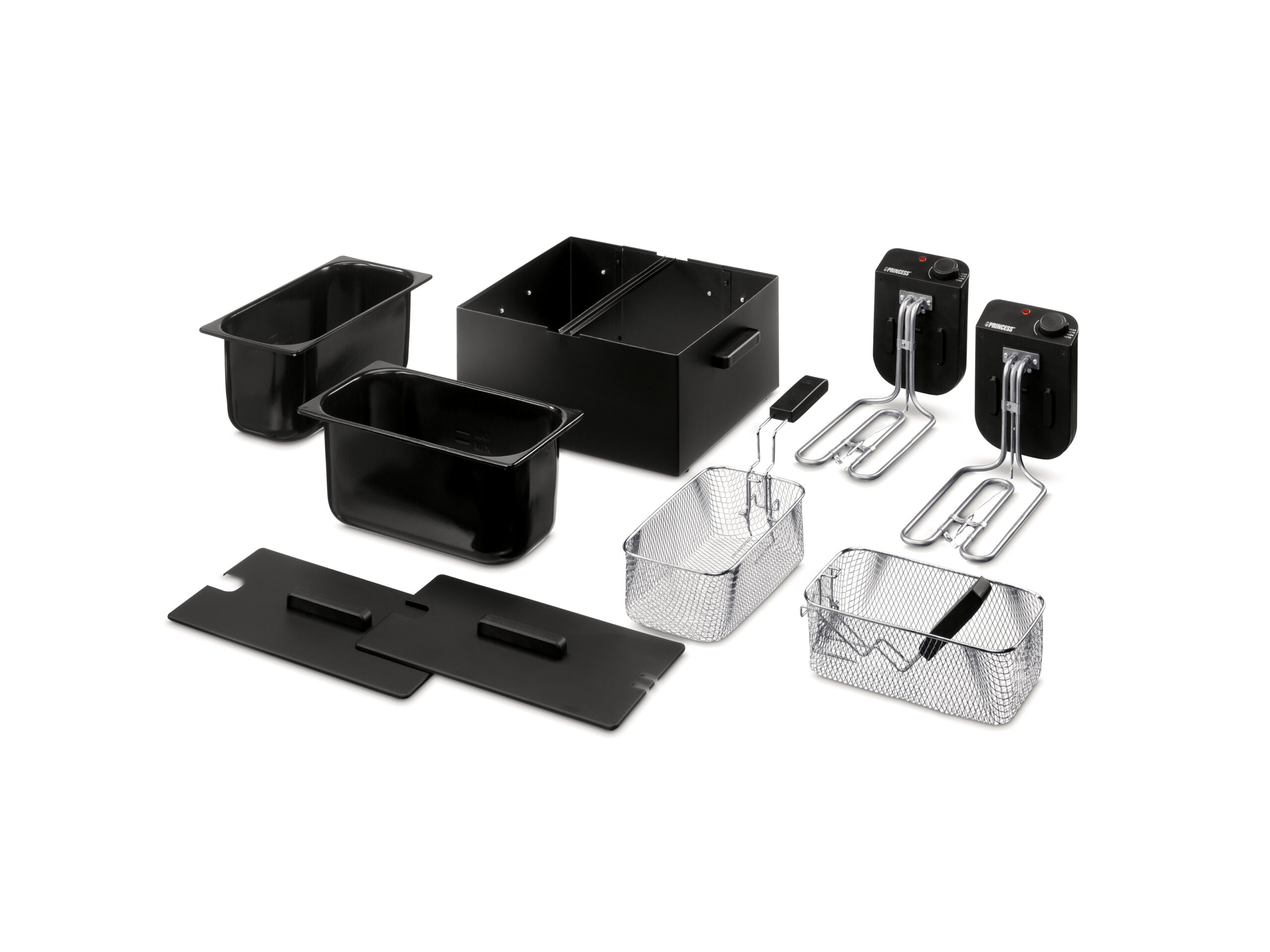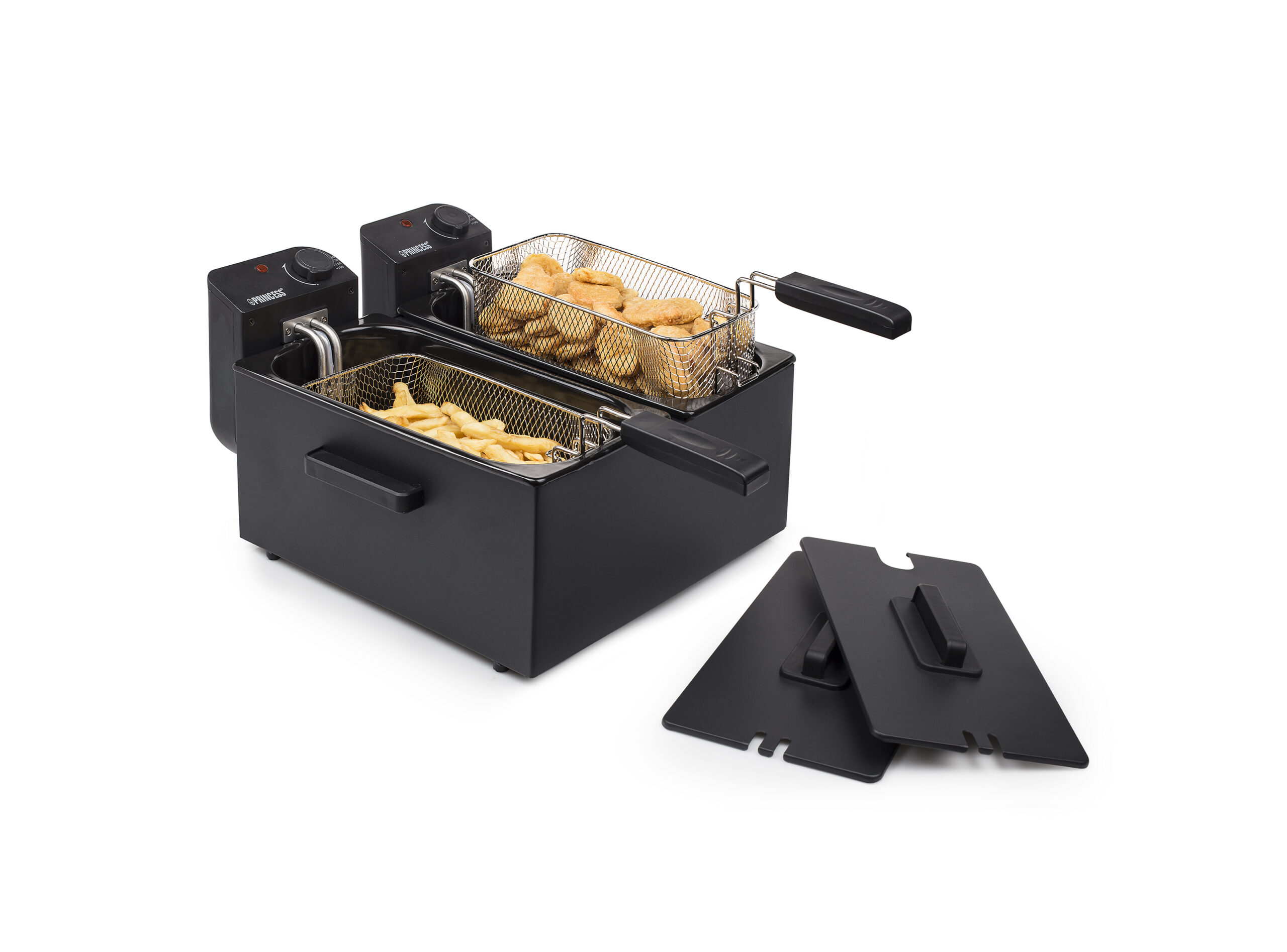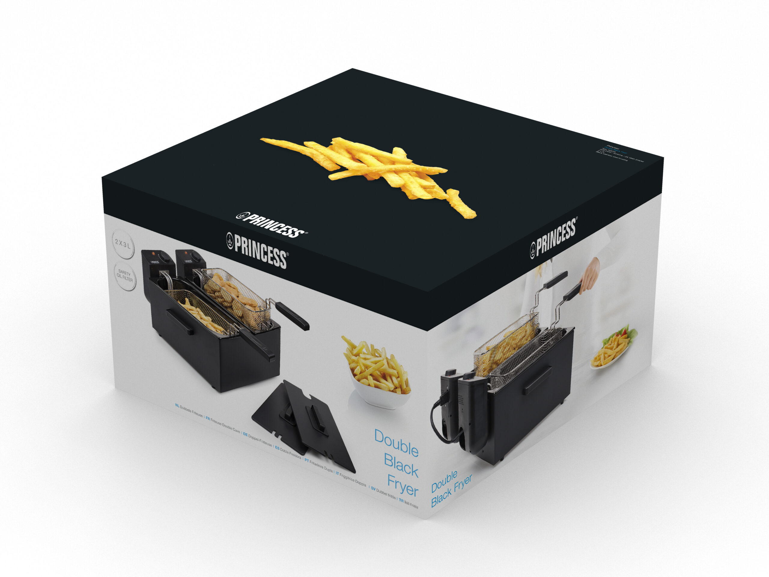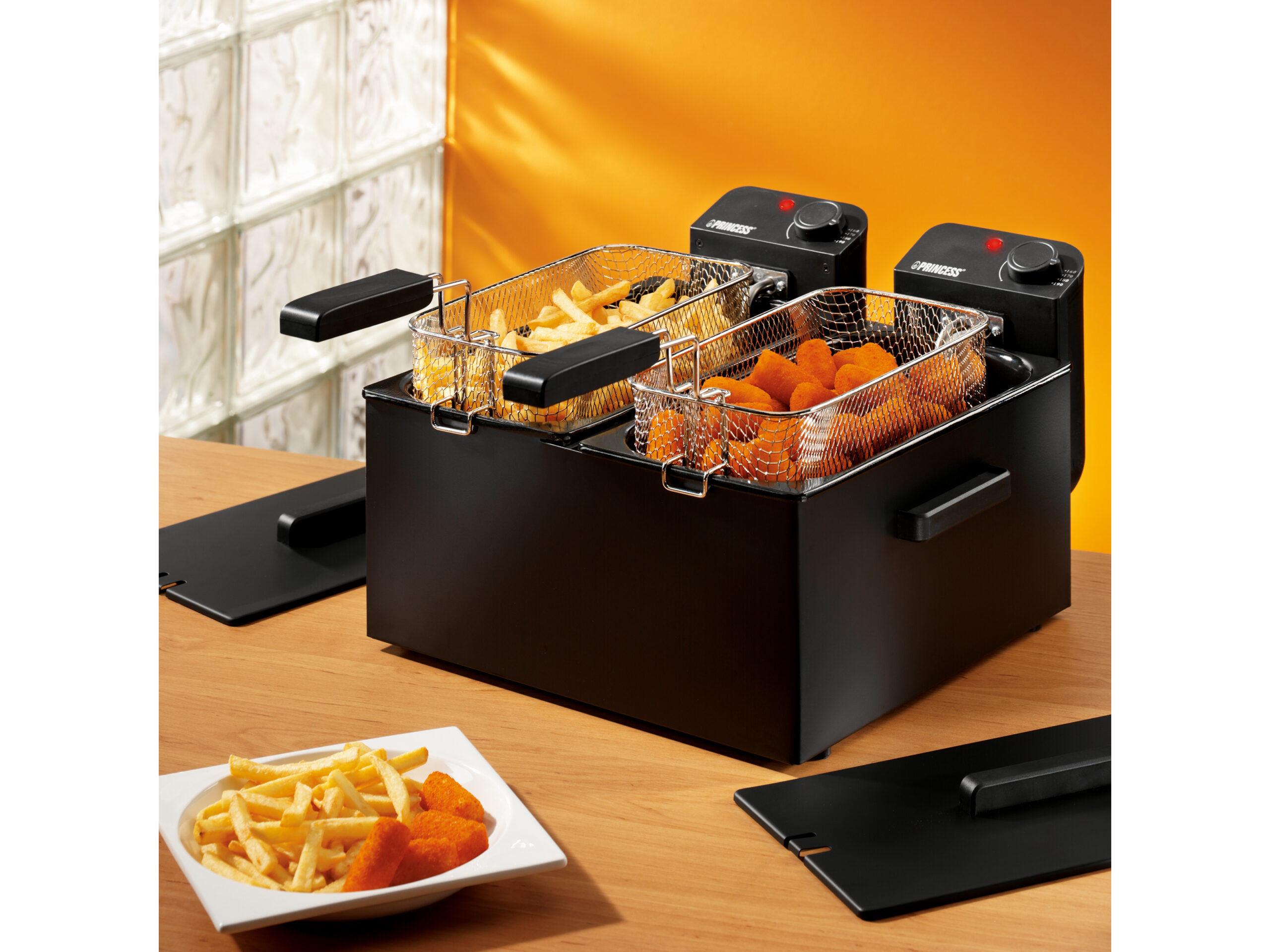 Doppia friggitrice Princess 183028 Black – Zona fredda – Capacità 2 X 3 litri Raddoppia la frittura e prepara pesce e patatine per tutta la famiglia in una volta sola, grazie a questa potente doppia friggitrice Princess 183028 Black. La friggitrice si riscalda molto rapidamente grazie all’elevata potenza di 2 x 1800 Watt. Entrambi i recipienti condividono la stessa spina, ma possono essere usati separatamente. Zona fredda per una frittura sana Un problema di molte friggitrici è quello di bruciare le briciole che cadono attraverso il cestello quando usi l’olio più di una volta. La doppia friggitrice Princess ha una speciale zona fredda che evita che questo accada. Tutte le piccole particelle finiscono nella zona fredda sotto l’elemento riscaldante e non bruciano. In questo modo, l’olio resta pulito molto più a lungo e non troverai resti neri nelle patatine. Sistema a spina singola per una maggiore sicurezza La doppia friggitrice Princess ha una sola spina di corrente e richiede una sola presa a parete per funzionare. I due elementi riscaldanti sono collegati tra loro e possono essere facilmente rimossi. Inoltre, la friggitrice ha due termostati separati che permettono di controllare ciascuna unità in modo indipendente e cucinare patatine e pesce, o snack allo stesso tempo, alla temperatura ideale. Facile da pulire I recipienti interni smaltati della friggitrice Princess Superior possono essere rimossi per pulirli e cambiare l’olio facilmente. Tutte le parti della friggitrice sono removibili e la maggior parte sono lavabili in lavastoviglie, per permetterti di pulire la macchina in un batter d’occhio. Inoltre le impugnature dei cestelli di frittura possono essere chiuse per pulire e riporre facilmente la friggitrice. Princess offre 24 mesi di garanzia su tutti i prodotti Contenuto della confezione: Doppia Friggitrice Princess, 2 cestelli con impugnatura, 2 recipienti smaltati removibili, manuale di istruzioni I motivi per scegliere la doppia friggitrice Princess: Prepara patatine e snack per tutta la famiglia, grazie alla capacità di 2 x 3 litri La zona fredda evita briciole bruciate e tiene l’olio molto più pulito Facile da pulire grazie alle parti lavabili in lavastoviglie Elevata potenza effettiva di 2 x 1800 Watt che permette alla friggitrice di scaldarsi molto velocemente