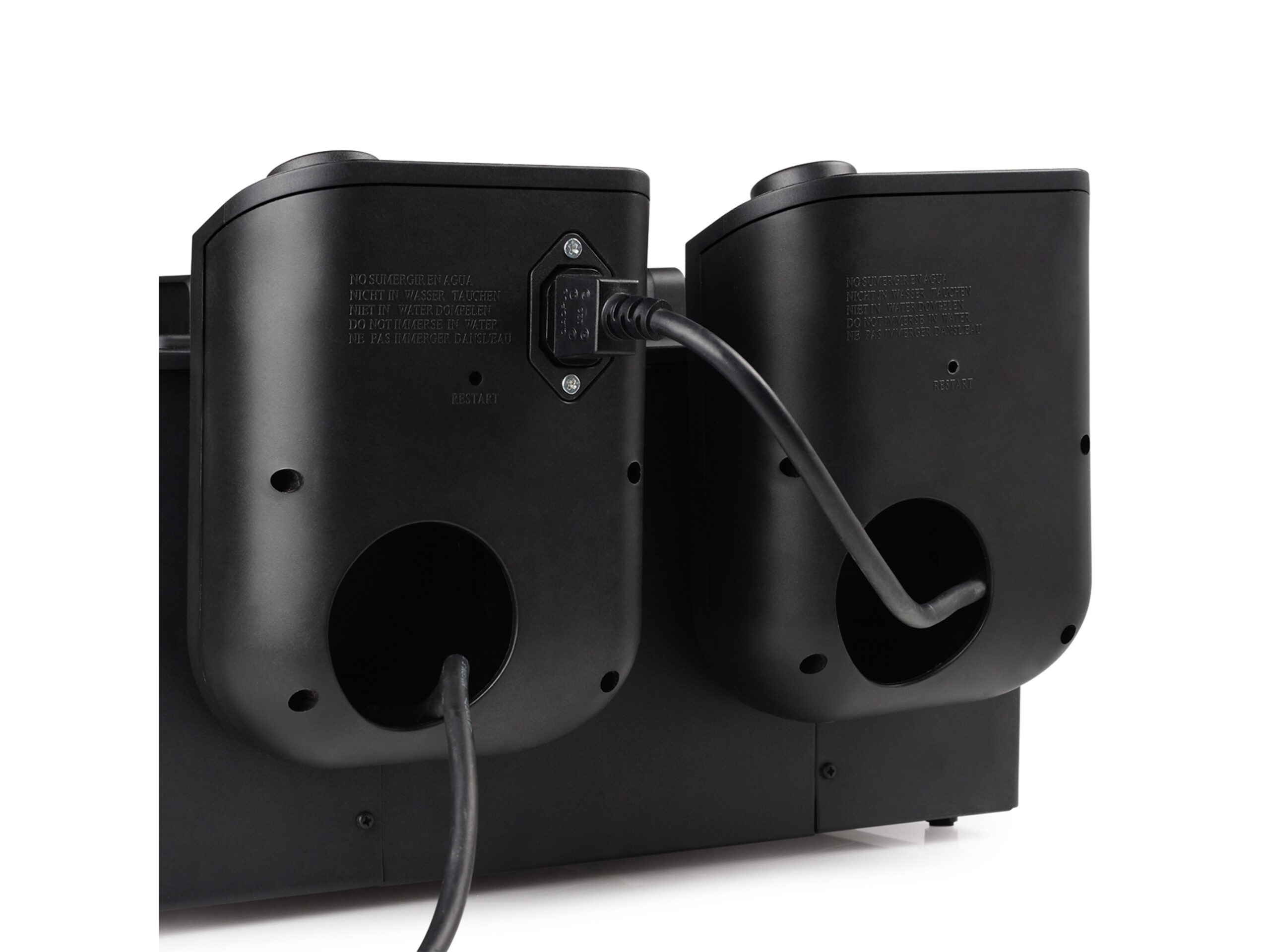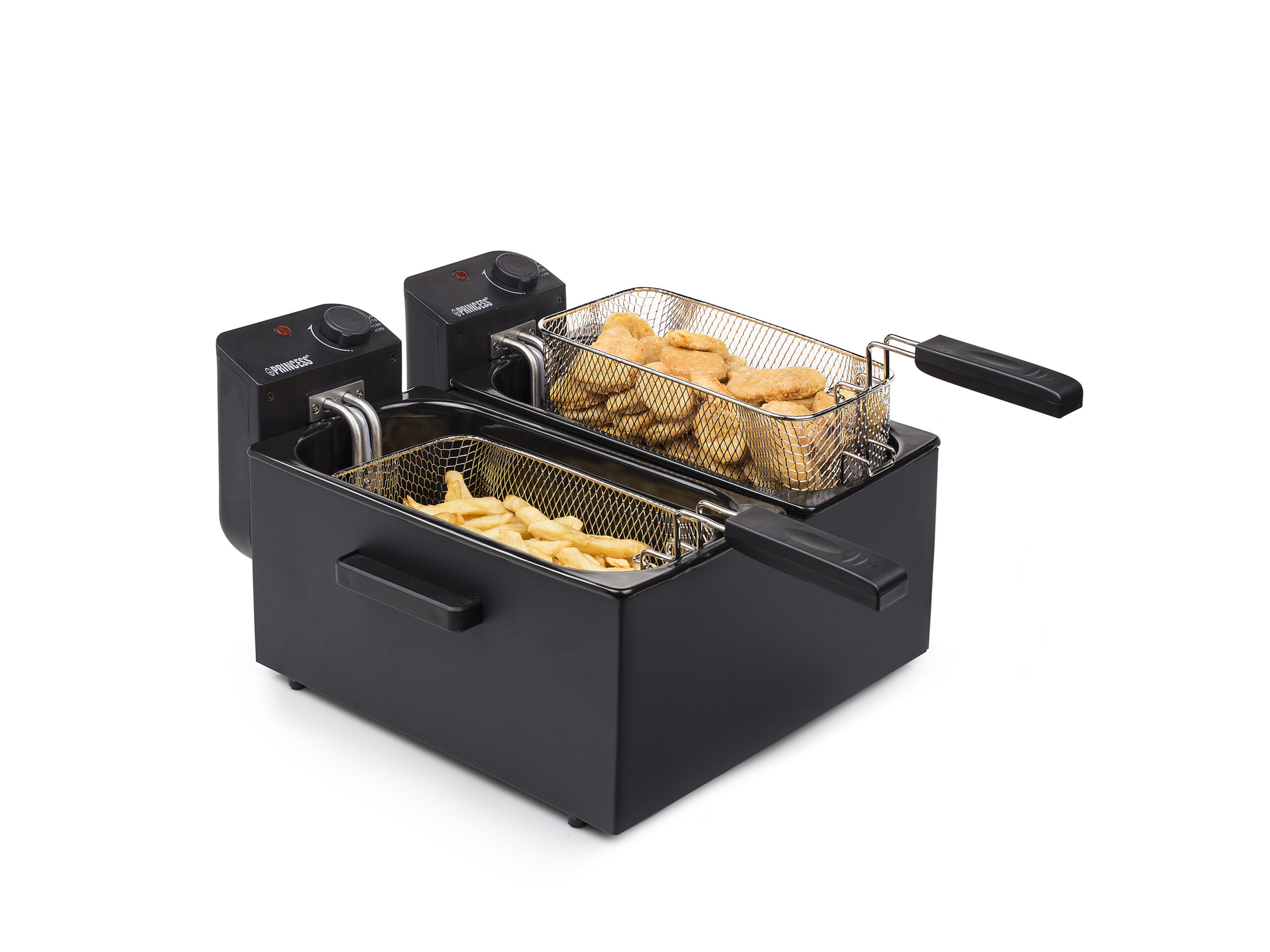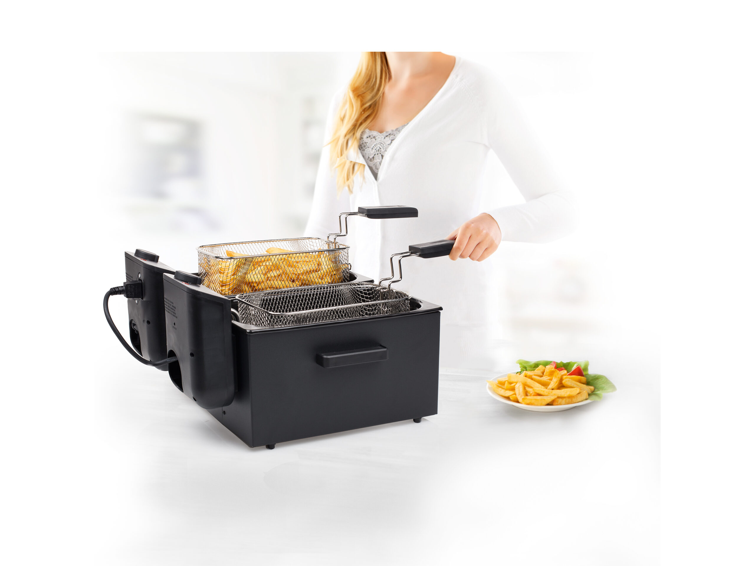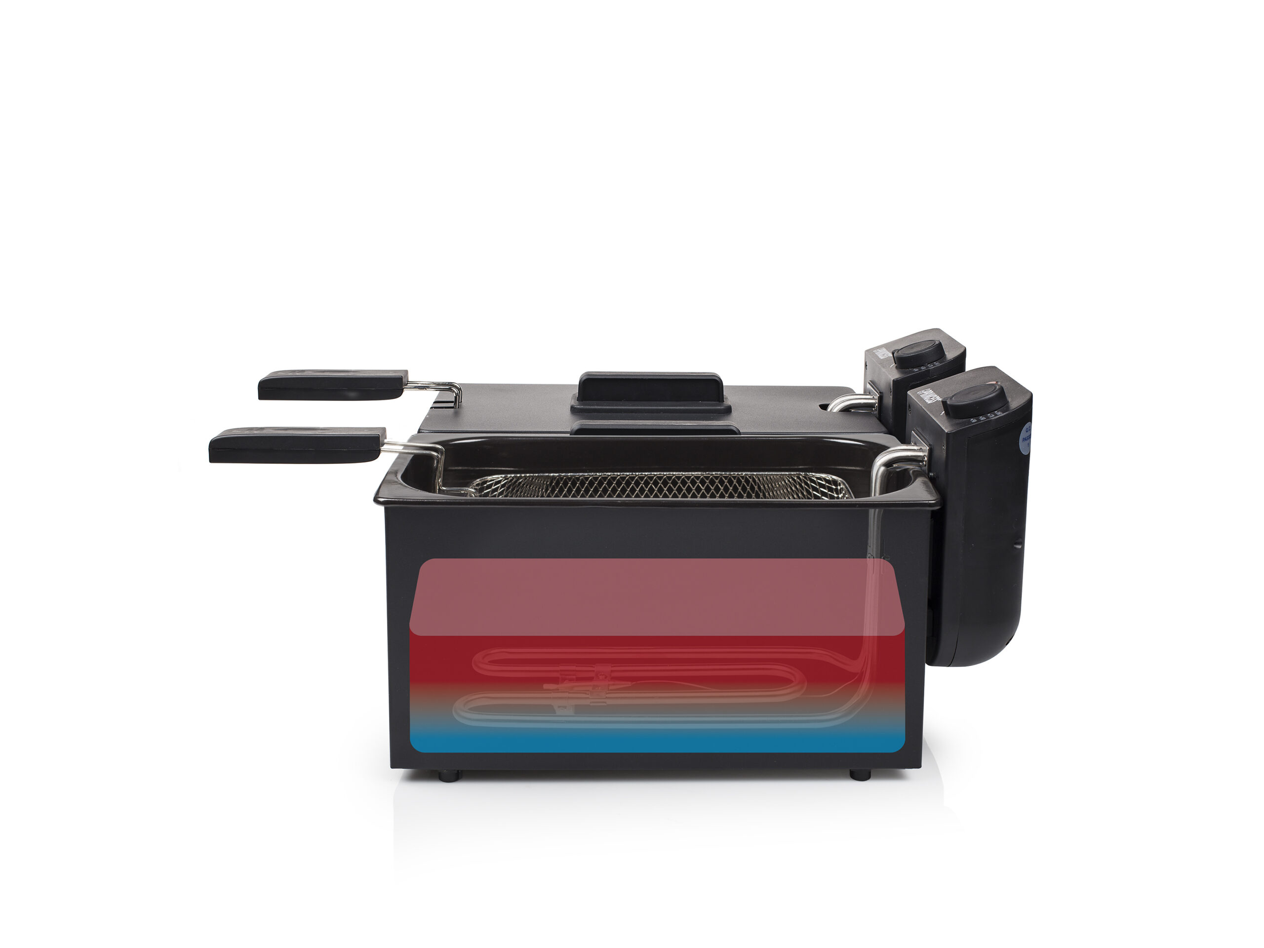 Doppia friggitrice Princess 183028 Black – Zona fredda – Capacità 2 X 3 litri Raddoppia la frittura e prepara pesce e patatine per tutta la famiglia in una volta sola, grazie a questa potente doppia friggitrice Princess 183028 Black. La friggitrice si riscalda molto rapidamente grazie all’elevata potenza di 2 x 1800 Watt. Entrambi i recipienti condividono la stessa spina, ma possono essere usati separatamente. Zona fredda per una frittura sana Un problema di molte friggitrici è quello di bruciare le briciole che cadono attraverso il cestello quando usi l’olio più di una volta. La doppia friggitrice Princess ha una speciale zona fredda che evita che questo accada. Tutte le piccole particelle finiscono nella zona fredda sotto l’elemento riscaldante e non bruciano. In questo modo, l’olio resta pulito molto più a lungo e non troverai resti neri nelle patatine. Sistema a spina singola per una maggiore sicurezza La doppia friggitrice Princess ha una sola spina di corrente e richiede una sola presa a parete per funzionare. I due elementi riscaldanti sono collegati tra loro e possono essere facilmente rimossi. Inoltre, la friggitrice ha due termostati separati che permettono di controllare ciascuna unità in modo indipendente e cucinare patatine e pesce, o snack allo stesso tempo, alla temperatura ideale. Facile da pulire I recipienti interni smaltati della friggitrice Princess Superior possono essere rimossi per pulirli e cambiare l’olio facilmente. Tutte le parti della friggitrice sono removibili e la maggior parte sono lavabili in lavastoviglie, per permetterti di pulire la macchina in un batter d’occhio. Inoltre le impugnature dei cestelli di frittura possono essere chiuse per pulire e riporre facilmente la friggitrice. Princess offre 24 mesi di garanzia su tutti i prodotti Contenuto della confezione: Doppia Friggitrice Princess, 2 cestelli con impugnatura, 2 recipienti smaltati removibili, manuale di istruzioni I motivi per scegliere la doppia friggitrice Princess: Prepara patatine e snack per tutta la famiglia, grazie alla capacità di 2 x 3 litri La zona fredda evita briciole bruciate e tiene l’olio molto più pulito Facile da pulire grazie alle parti lavabili in lavastoviglie Elevata potenza effettiva di 2 x 1800 Watt che permette alla friggitrice di scaldarsi molto velocemente