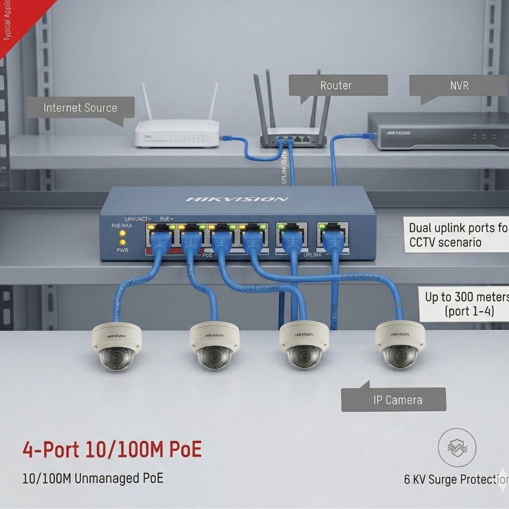 Lo Switch PoE Hikvision 4 porte è progettato per semplificare l’installazione di sistemi di videosorveglianza e reti professionali. Grazie alla tecnologia Power over Ethernet (PoE), consente di trasmettere alimentazione e dati tramite un unico cavo di rete, riducendo cablaggi e costi di installazione.