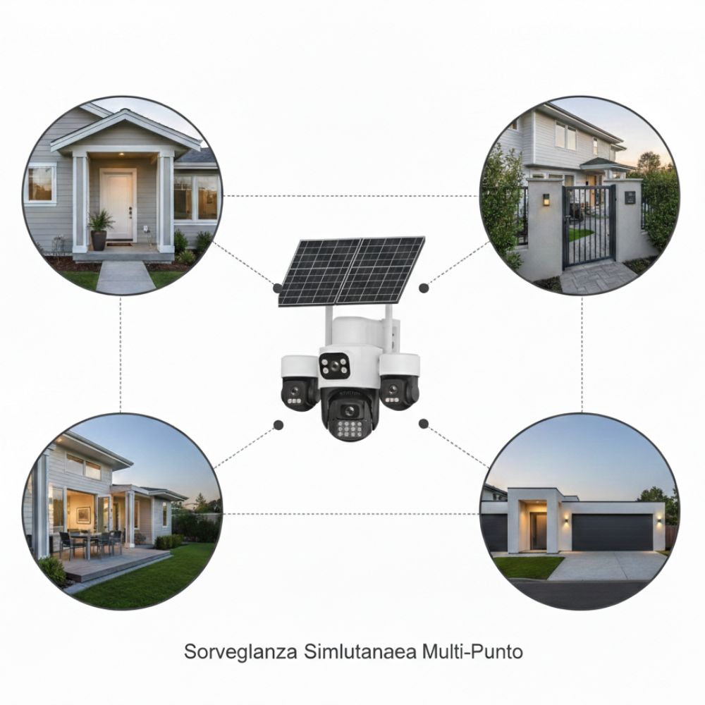 Sistema di videosorveglianza avanzato con tecnologia Quadruple Vision, alimentazione solare autonoma e connettività 4G LTE. Progettata per funzionare senza WiFi e senza cablaggi, è ideale per aree remote come terreni, frutteti, cantieri, parcheggi e proprietà isolate.