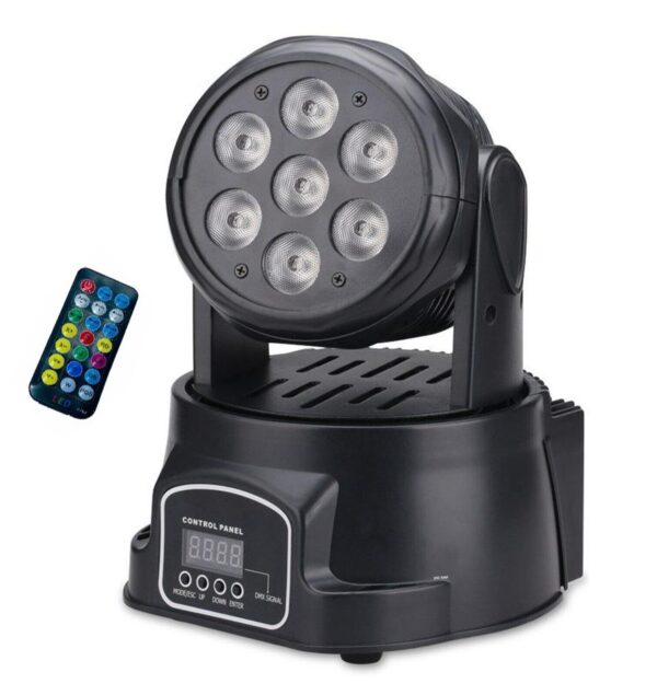 Proiettore LED portatile con 7 luci RGBW rotanti, ideale per creare atmosfere festive in ogni evento.
