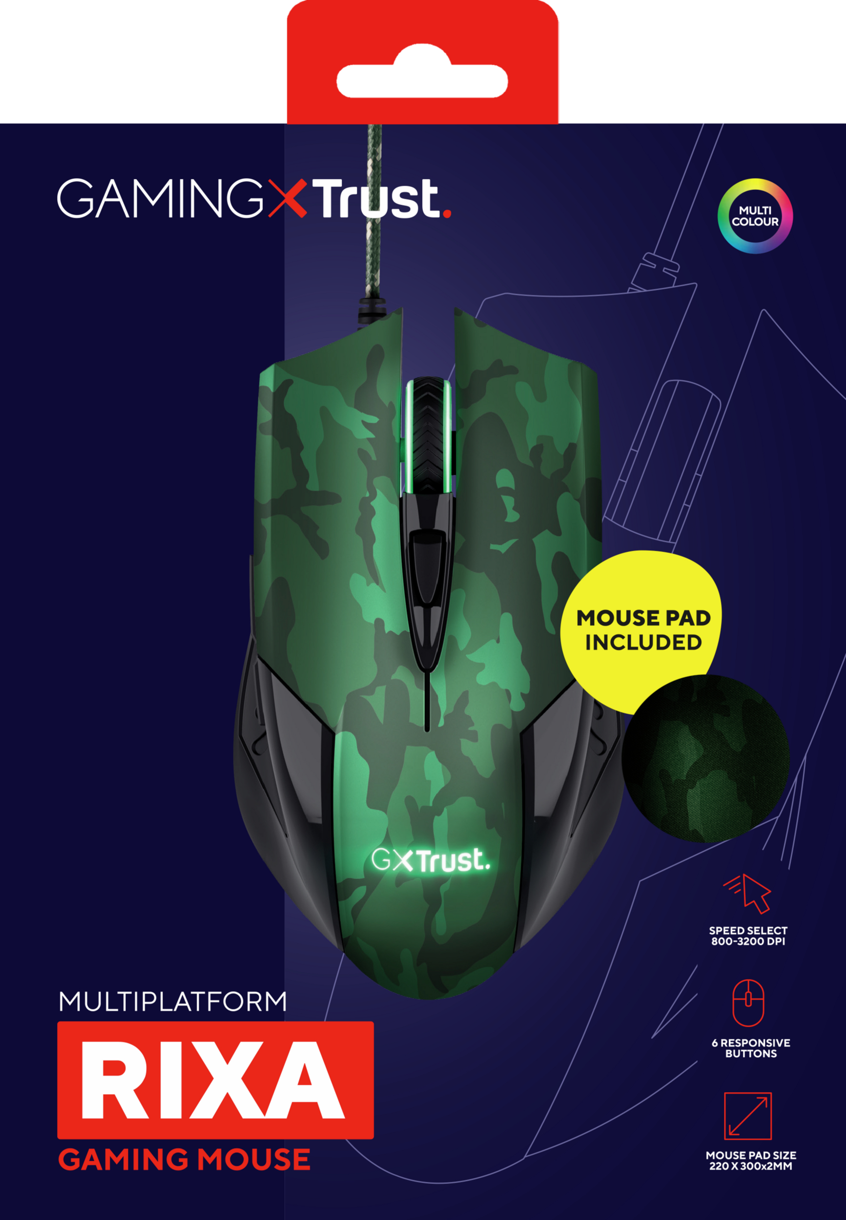 Con il mouse Trust GXT 781 Rixa & il suo tappetino, si ottengono due elementi gaming essenziali insieme: un mouse preciso con 6 pulsanti e un tappetino per mouse antiscivolo con una superficie ottimizzata. Si presentano in una stampa mimetica coordinata e, grazie all’illuminazione LED in 4 colori del mouse con effetto breathing, questa coppia rappresenta un potente contributo di impatto estetico per la configurazione gaming.